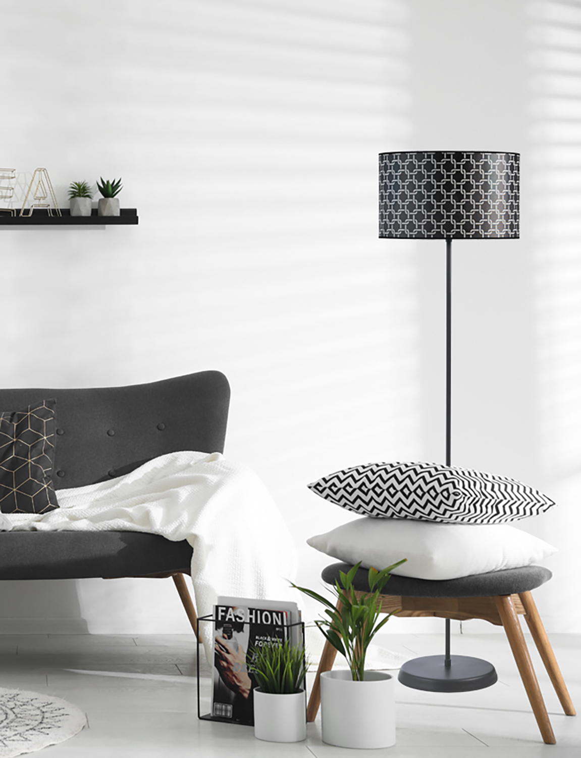 Φωτιστικό δαπέδου 1φ Ε27 σε μοντέρνα γραμμή,μεταλλικά μέρη σε χρώμα μαύρο και αμπαζούρ ύφασμα σε χρώμα μαύρο/λευκό Φ40