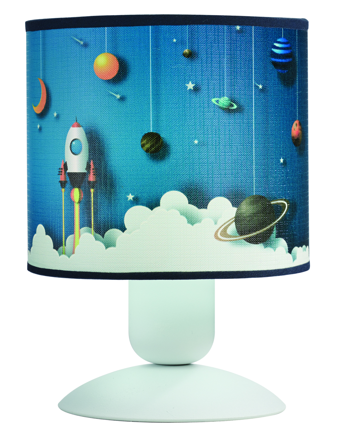 Φωτιστικό πορτατίφ παιδικό αμπαζούρ,ύφασμα με σχέδιο διάστημα σε μπλέ απόχρωση και βάση μεταλλική λευκή Ε27 Φ15