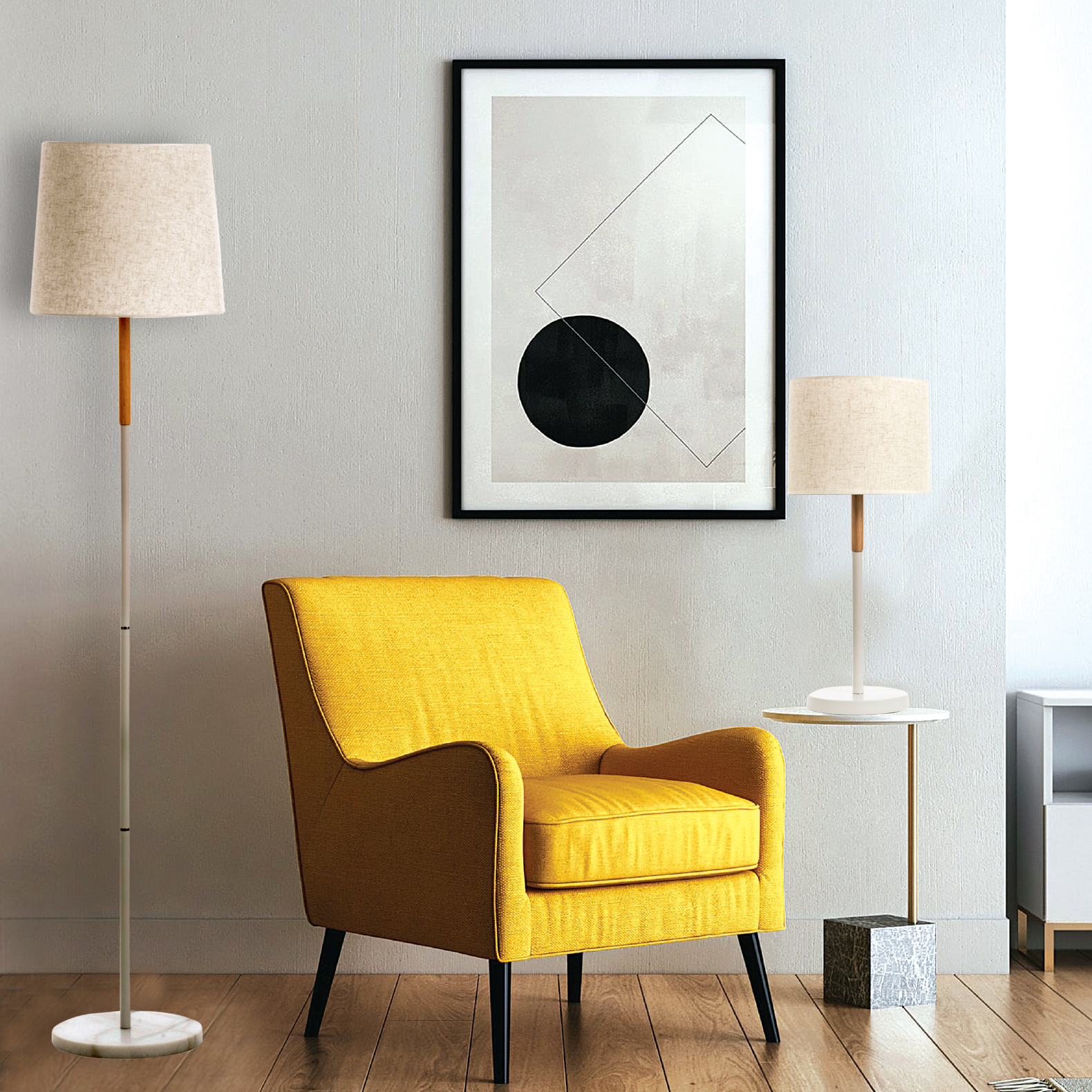 Επιδαπέδιο φωτιστικό από λευκό μέταλλο με διακριτική ύπαρξη ξύλου στο πάνω μέρος του. Η βάση του είναι από ιδιαίτερο λευκό μάρμαρο. Το υφασμάτινο καπέλο στην μπεζ απόχρωση δίνει ένα ρομαντικό ύφος και στο φωτιστικό και στον χώρο τοποθέτησής του.