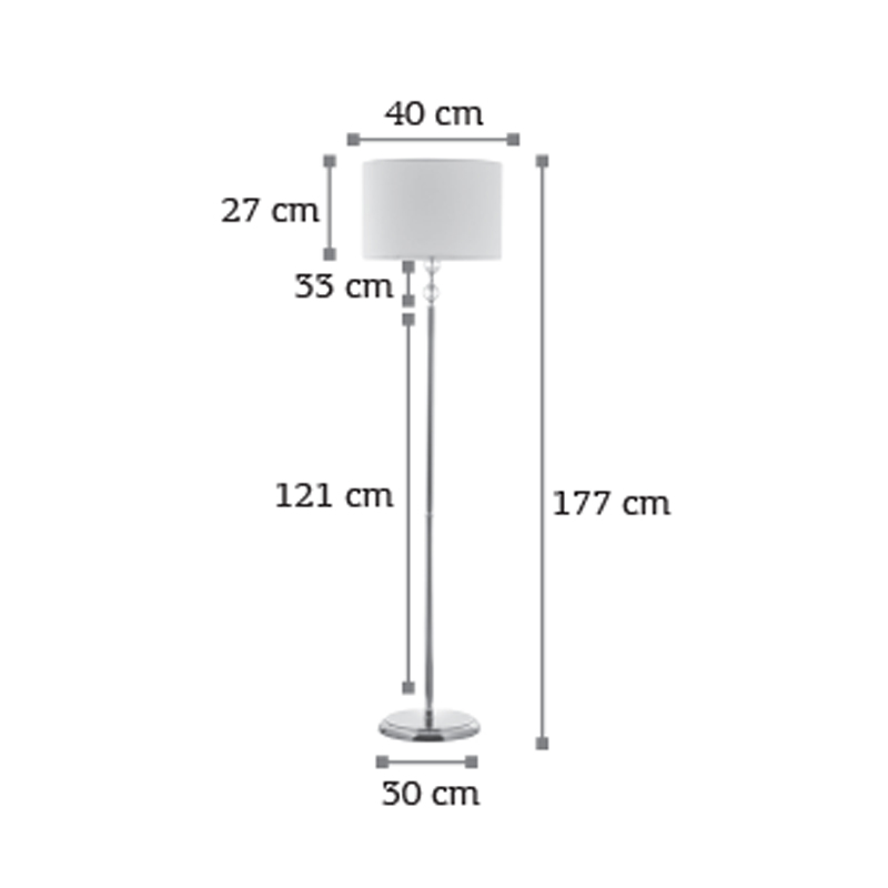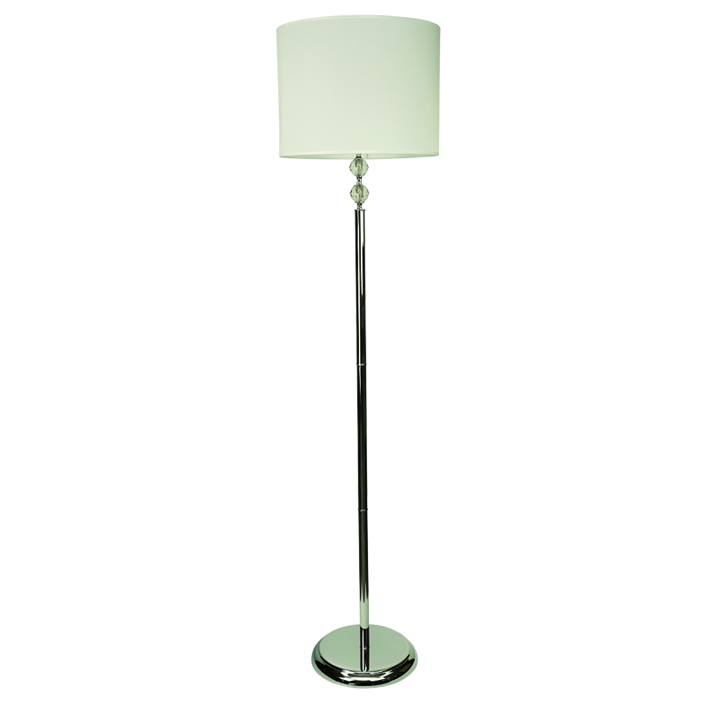 Πρόκειται για ένα χρώμιο μεταλλικό επιδαπέδιο φωτιστικό με λευκό υφασμάτινο καπέλο. Τη λιτή του σχεδίαση συμπληρώνουν οι δύο διάφανοι κρύσταλλοι που του δίνουν μια επιπλέον λάμψη.