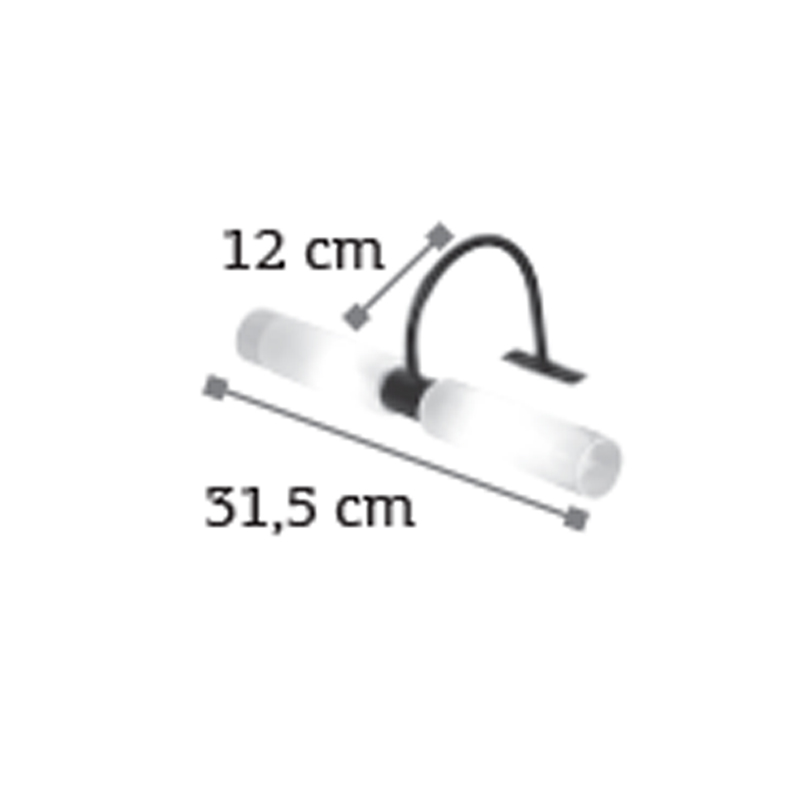 Πρόκειται για ένα επιτοίχιο φωτιστικό κατασκευασμένο από μέταλλο σε μαύρη απόχρωση με δύο λαμπτήρες που καλύπτονται από κυλινδρικό γυαλί αμμοβολής με διάφανες λεπτομέρειες. Είναι η ιδανική επιλογή για φωτισμό μπάνιου τοποθετημένο πάνω από τον καθρέπτη και όταν υπάρχει έλλειψη χώρου για την βάση του. Το φως διαχέεται ομοιόμορφα.