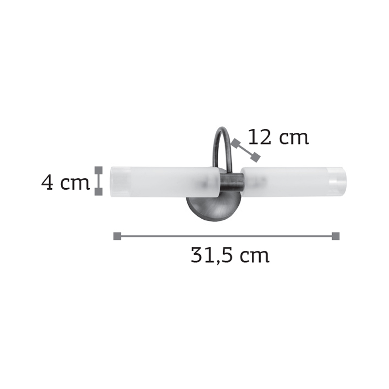 Πρόκειται για ένα επιτοίχιο φωτιστικό κατασκευασμένο από μέταλλο σε χρώμιο απόχρωση με δύο λαμπτήρες που καλύπτονται από κυλινδρικό γυαλί αμμοβολής με διάφανες λεπτομέρειες. Είναι η ιδανική επιλογή για φωτισμό μπάνιου τοποθετημένο πάνω από τον καθρέπτη αφού το φως διαχέεται ομοιόμορφα.