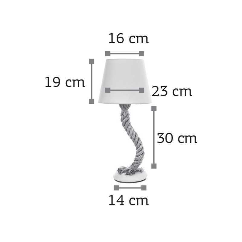 Πρόκειται για ένα επιτραπέζιο φωτιστικό από καφέ σχοινί και λευκό μέταλλο. Είναι ιδανικό για όποιον επιδιώκει μια ρομαντική διάθεση στο χώρο του, καθώς έχει και λευκό υφασμάτινο καπέλο που εξυπηρετεί τον σκοπό αυτόν.
