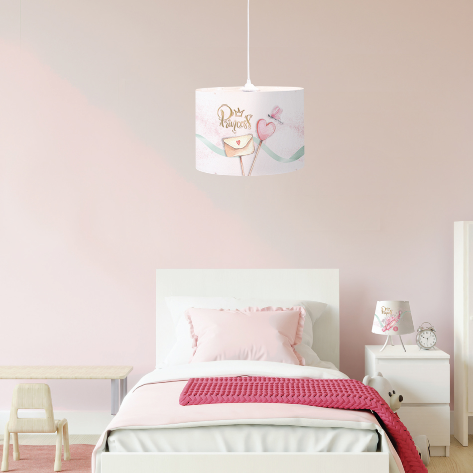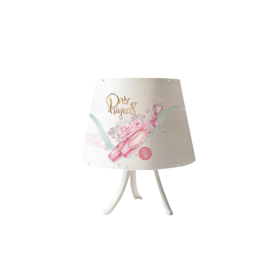 Πρόκειται για ένα επιτραπέζιο παιδικό φωτιστικό από μέταλλο σε λευκή απόχρωση με πολύχρωμο καπέλο.