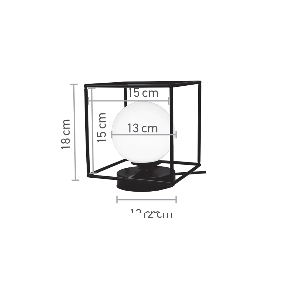 Πρόκειται για ένα γεωμετρικό επιτραπέζιο φωτιστικό κατασκευασμένο από μαύρο μέταλλο και λευκή οπαλίνα. Το φως διαχέεται ομοιόμορφα.