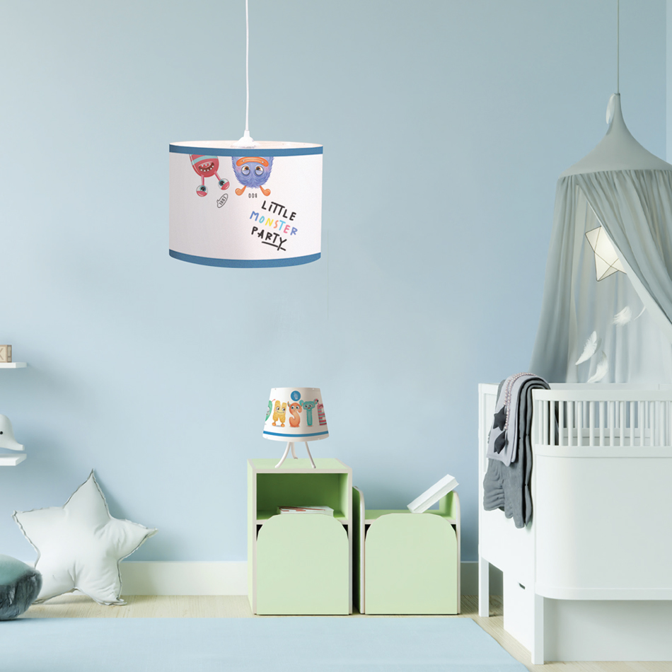 Πρόκειται για ένα κρεμαστό παιδικό φωτιστικό με λευκή ρυθμιζόμενη ανάρτηση και πολύχρωμο καπέλο.