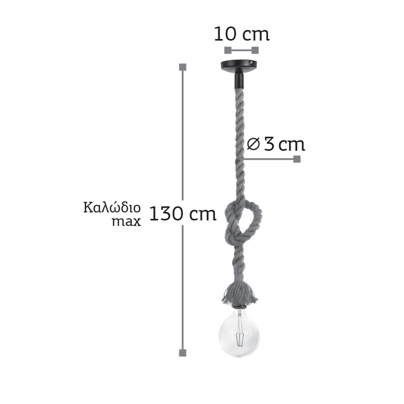 Μονόφωτο κρεμαστό φωτιστικό κατασκευασμένο από σχοινί και μεταλλική μαύρη λεπτομέρεια στην οροφή. Το ύψος του μπορεί να ρυθμιστεί είτε κόβοντάς το σχοινί, είτε πλέκοντάς το δημιουργώντας επιπλέον κόμπο!