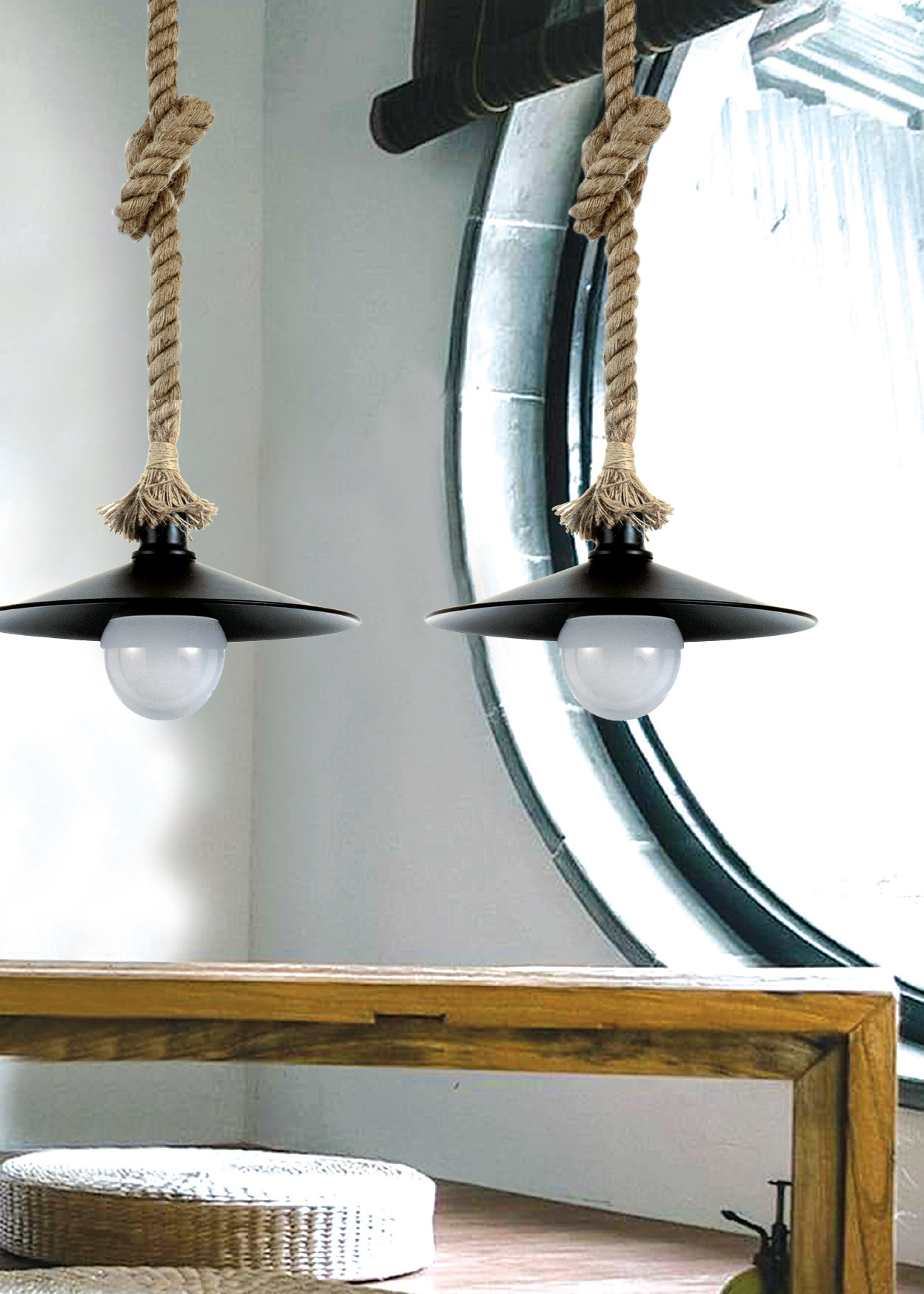 Πρόκειται για ένα κρεμαστό φωτιστικό με συνδυασμό καφέ σχοινιού και μαύρου μετάλλου. Η ανάρτηση από σχοινί μπορεί να ρυθμιστεί για να προσαρμοστεί στον κάθε χώρο.