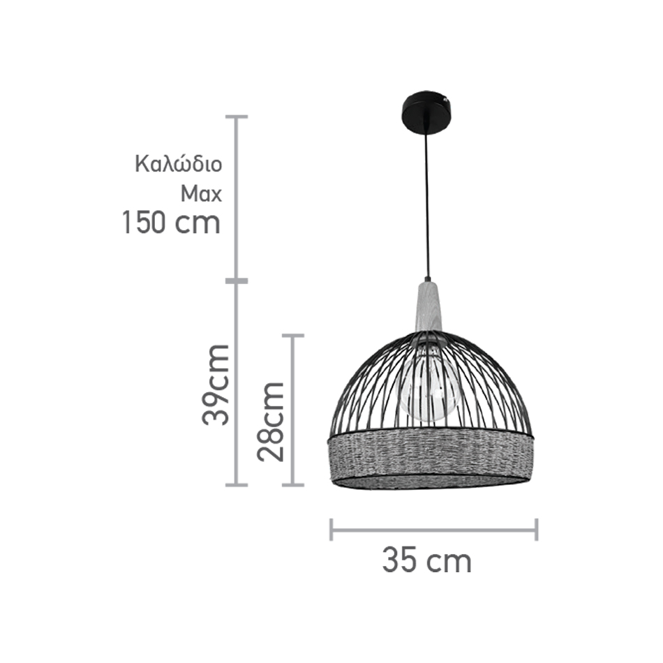InLight Κρεμαστό φωτιστικό από μαύρο μέταλλο, σχοινί και ξύλο 1XE27 D:35cm (4027-Α)