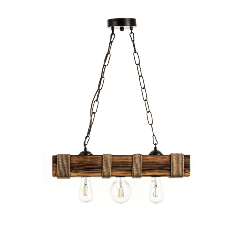Πρόκειται για ένα κρεμαστό με τρεις λαμπτήρες που συνδυάζει αρμονικά το ξύλο και το σχοινί. Το προϊόν ολοκληρώνει η μαύρη αλυσίδα που του επιτρέπει να προσαρμόζεται ιδανικά στον κάθε χώρο.