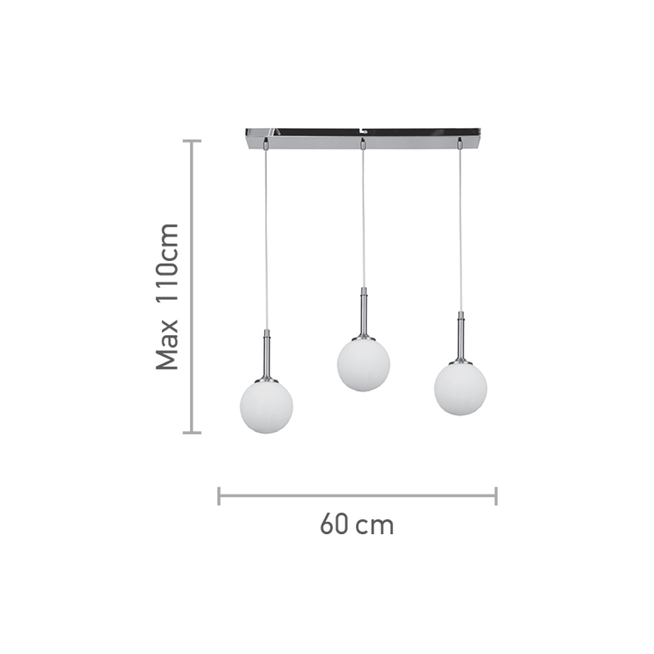 Πρόκειται για ένα χρυσαφί μεταλλικό φωτιστικό με λευκή οπαλίνα και τρεις λαμπτήρες. Το ύψος μπορεί να ρυθμιστεί ώστε να προσαρμοστεί στον μοντέρνο χώρο τοποθέτησής του.