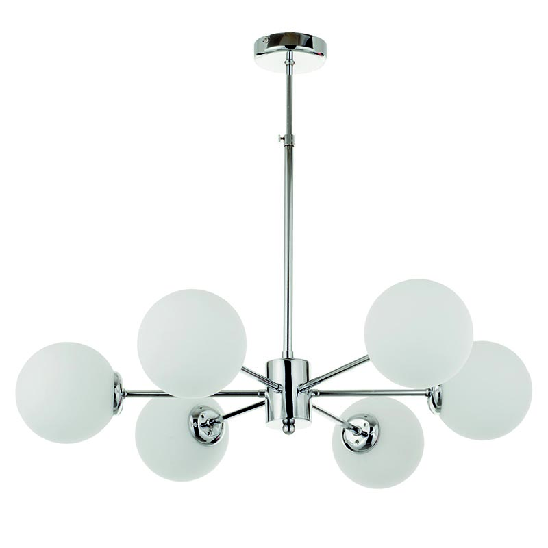 Πρόκειται για ένα χρώμιο μεταλλικό φωτιστικό με λευκή οπαλίνα στο τελείωμα και έξι λαμπτήρες. Η μίνιμαλ σχεδίασή του το τοποθετεί ιδανικά σε οποιονδήποτε μοντέρνο εσωτερικό χώρο. Η ανάρτησή του είναι μεταλλική και ρυθμιζόμενη ώστε να προσαρμοστεί ιδανικά στον χώρο τοποθέτησής του.